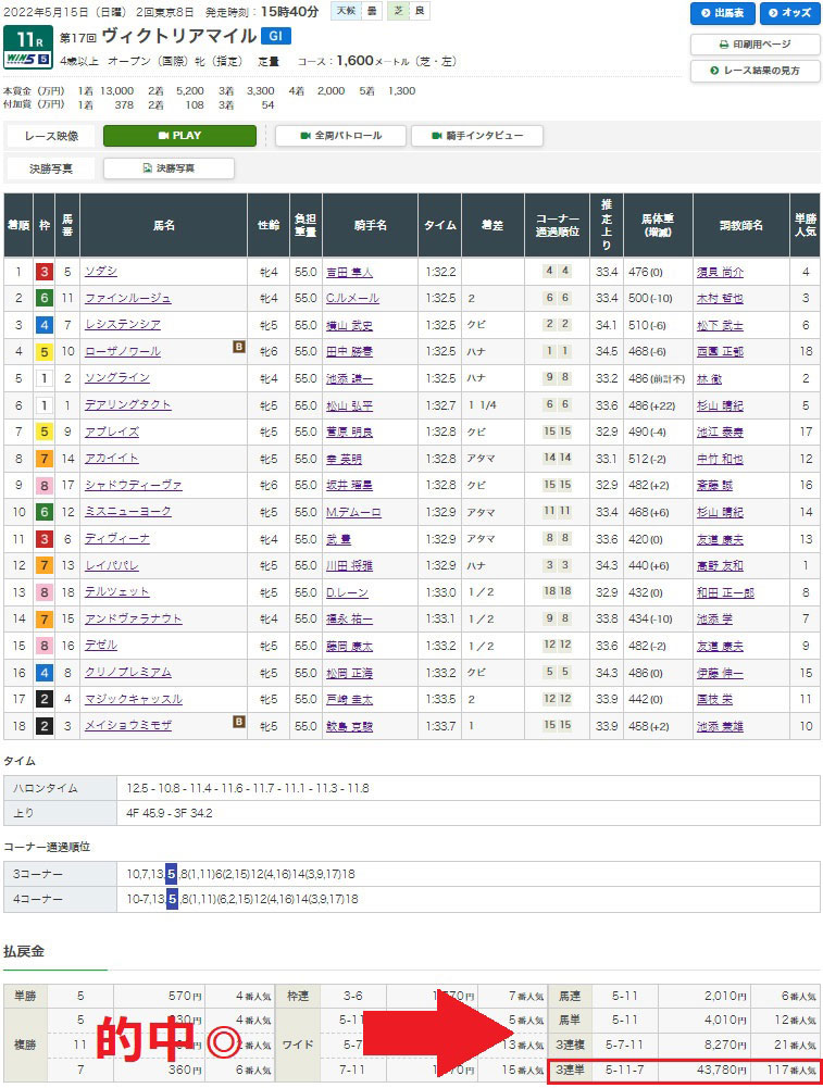 買い目点数が多いのが印象的、ですが例年のヴィクトリアマイル傾向を考えるとこれくらいの点数が妥当とも思える、その結果がコチラ!