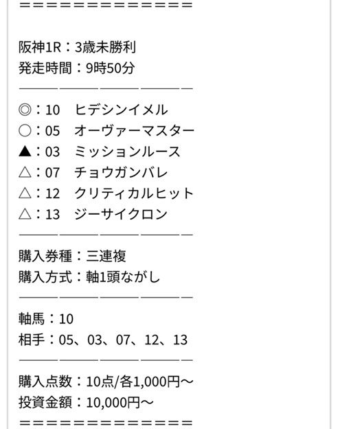 馬券代は1点1,000円で10,000円で購入。