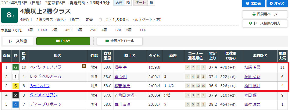 軸に置いた⑩が3着に滑り込み、相手に据えた③⑬が1着2着と馬券に絡む着順で予想どおりの結果に。