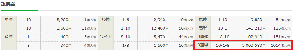 かなりの番狂わせで配当もなんと万馬券とんで100万馬券に!