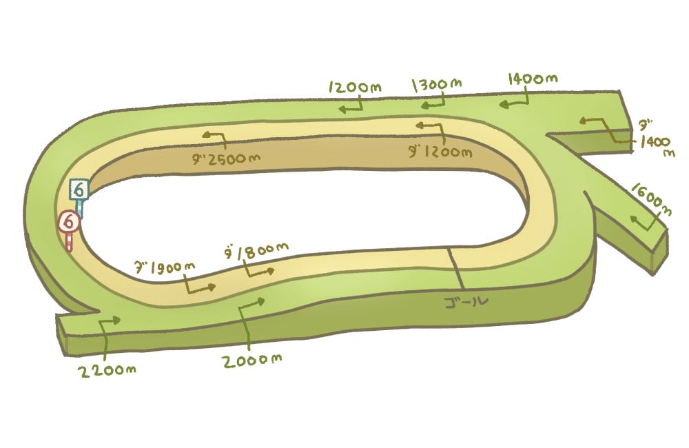 3~4コーナーがスパイラルカーブになっていて、緩やかなコーナーではあるが、カーブの出口で外に膨らんでしまいがちで、初コースの馬は戸惑う場合がある。
