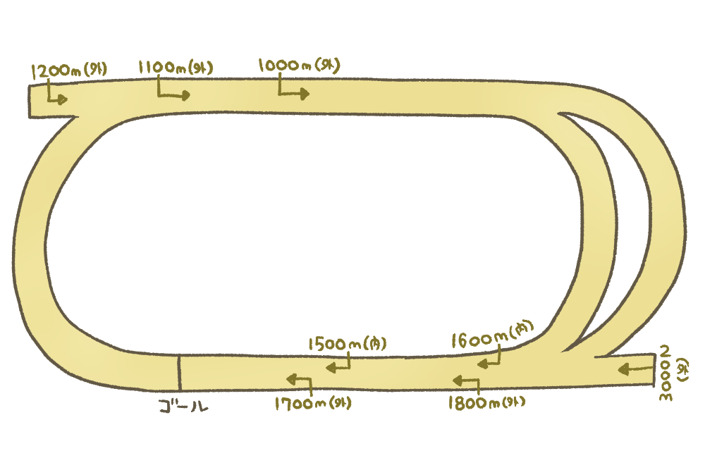 1000m~2600mまで多彩な距離でバリエーション豊かなレースが行われる。