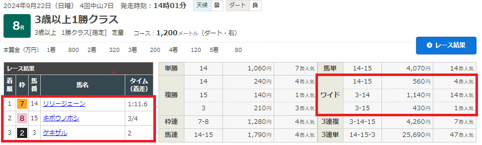 馬単は当てることが出来たので、次はワイドの予想がどうかも見たいと思います。