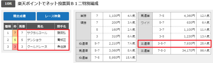 今回も前回と同じく3連複のボックスで1点500円の合計5,000円分の馬券を購入しました。