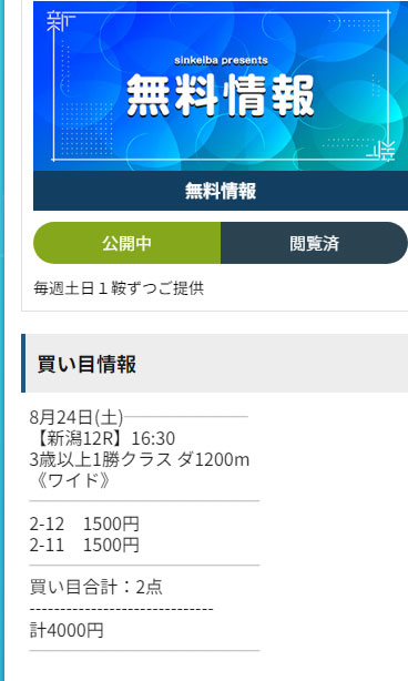 まずは8月24日 (土)に公開されていた買い目がこちらになります。