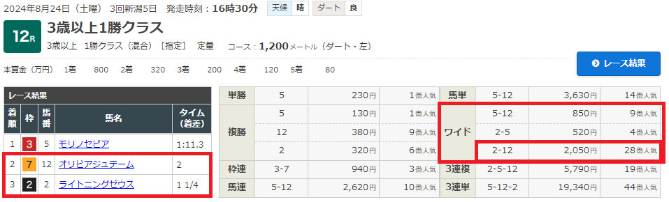2-12のワイドが的中!1番高い金額のワイドを当てることが出来ました!