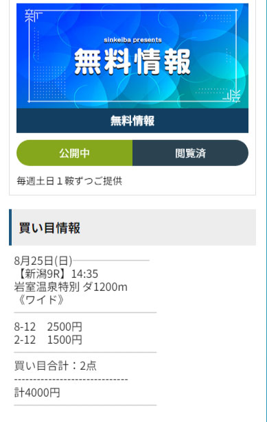 今回気になった【シンケイバ】の無料と有料の3回レースの馬券を購入しましたが、結果はというと…