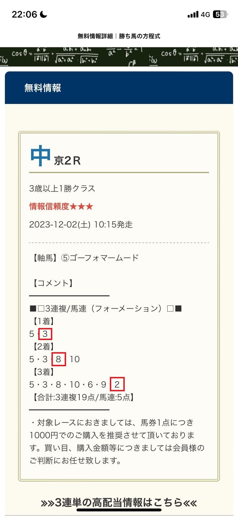 12月2日(土)中京2R3歳以上1勝クラスで無料情報3連複104.3倍的中!