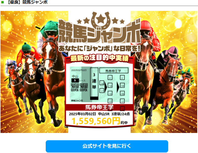 重賞の的中の期待が出来るサイトですので、ご登録されていない方はぜひ【競馬ジャンボ】へのご登録をオススメしたいと思います!