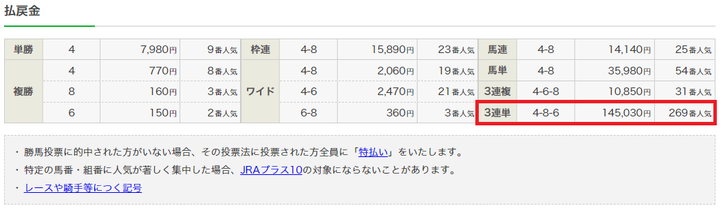 1点100円、たったの100円の馬券代で一撃14万5030円払い戻し!