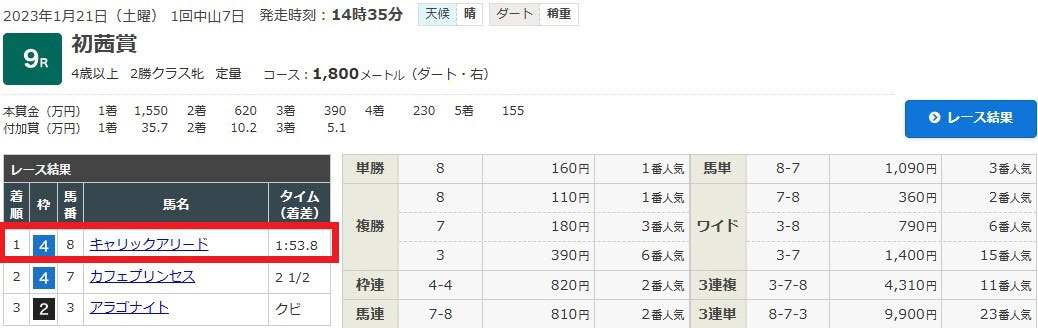 8-7-3で不的中!!やはり⑧キャリックアリードでしたね…
