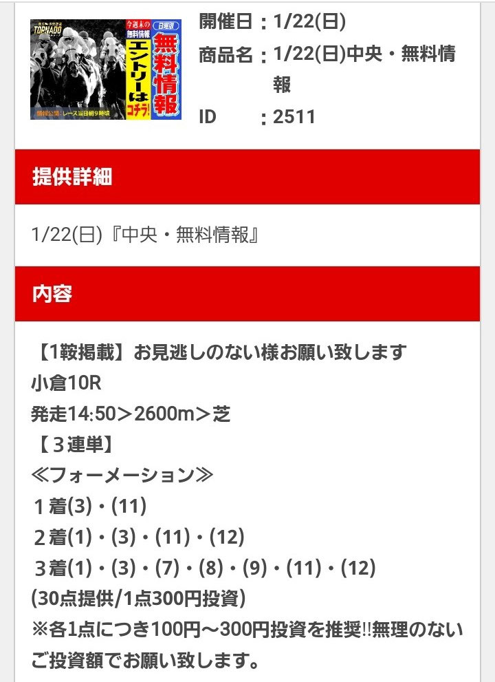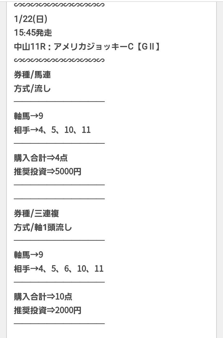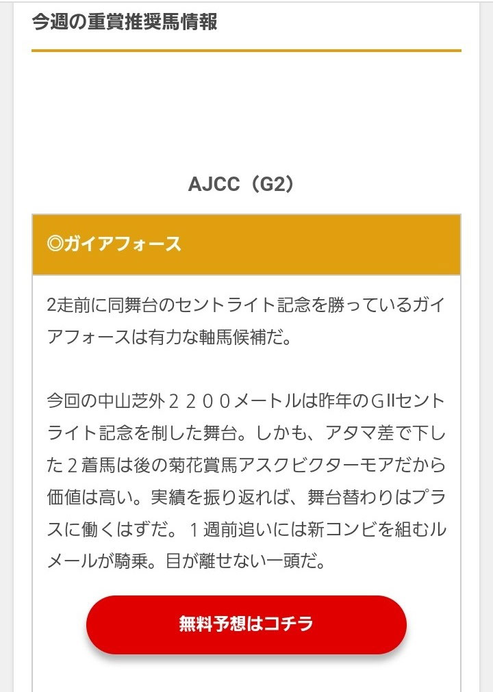 また、【今週の重賞推奨馬情報】という無料情報もあり、中山11RのAJCCの推奨馬が載ってったのでそちらも公開したいと思います。