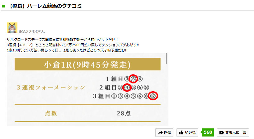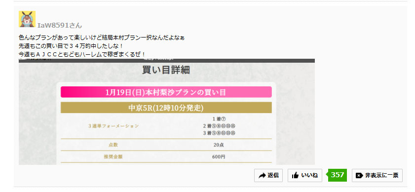 天才的な予想を量産しているようで無料情報はもちろん有料情報でも的中しているようでした。
