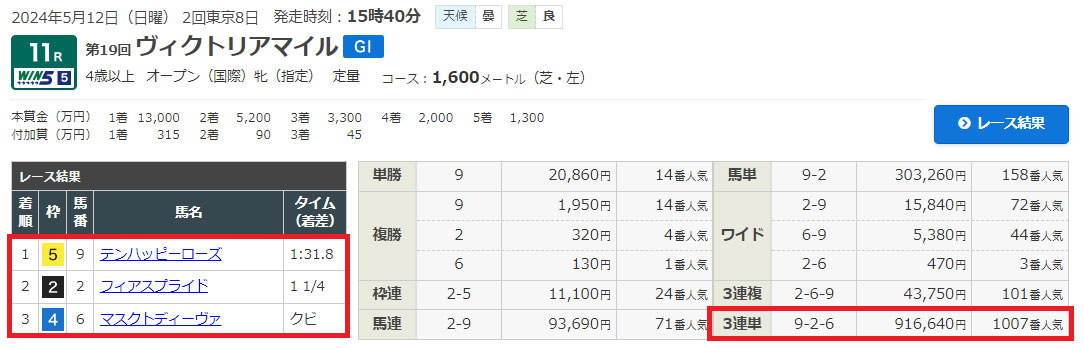 そして期待しつつヴィクトリアマイルの結果を見てみると…