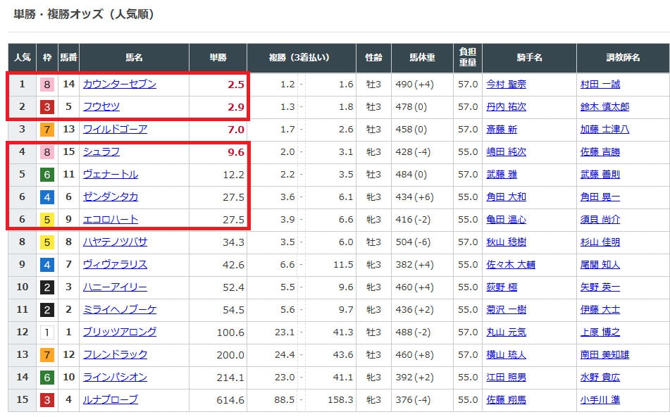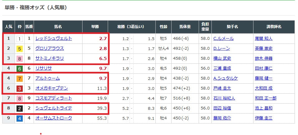選んだ馬のオッズを見てみると、
