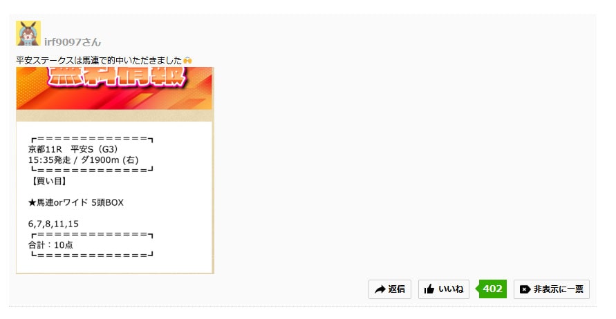 土曜日の平安ステークスの無料予想が的中していたようです。