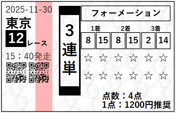 運営さんも人間だから間違える事はあると思う。 ワイド5頭だと15点じゃなくて10点ですよ(笑) 点数は間違えてるけど買い目はドンピシャ! 2026年を占う中山金杯、その無料予想で 1着~3着ドンピシャ! これなら3連単456倍も付いたから買っておけばよかった 来週はフェアリーステークス出すみたいだから重賞的中頼んだ! 次は3連単も買う!