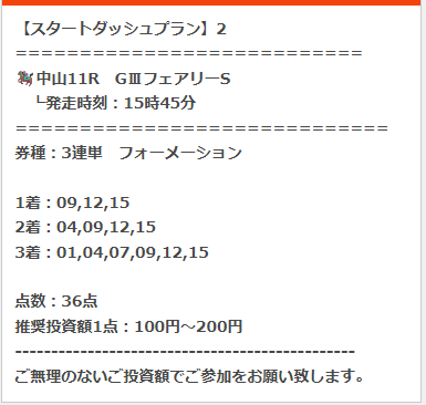 フェアリーステークスで263万7240円取った予想で今週も間違いなしだろな。