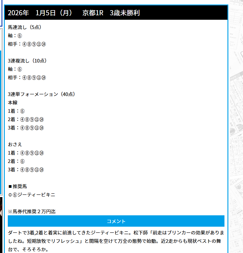 今日の無料情報で3連単239.6倍の的中貰えました! 配当重視で他の買い目は買ってないけど、馬連&3連複も当たってました。 1点500円で賭けていたので11万9800円ゲットです! 40過ぎたおっさんがこんな形でお年玉をもらえるとは(笑)
